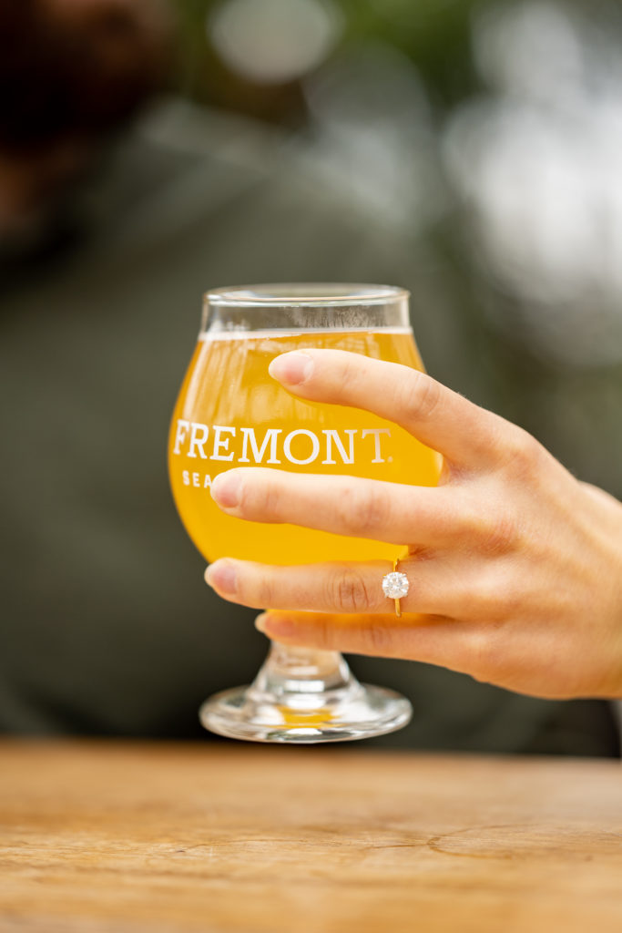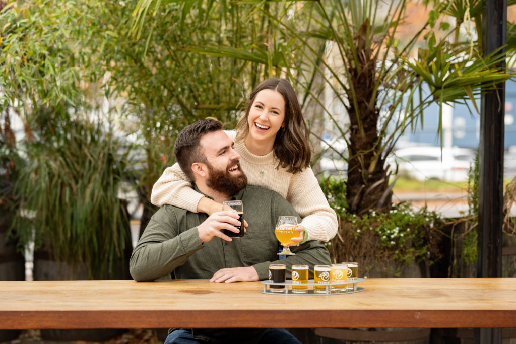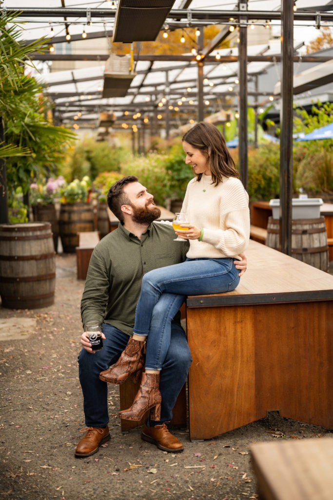 We embraced the weather and took some fun outdoor photos. The umbrellas actually made a cute prop and added an extra little touch to the photos! When the rain started coming down more, we switched it up and snapped some photos inside a brewery nearby for a different vibe. All of their engagement photos ended up coming out great!