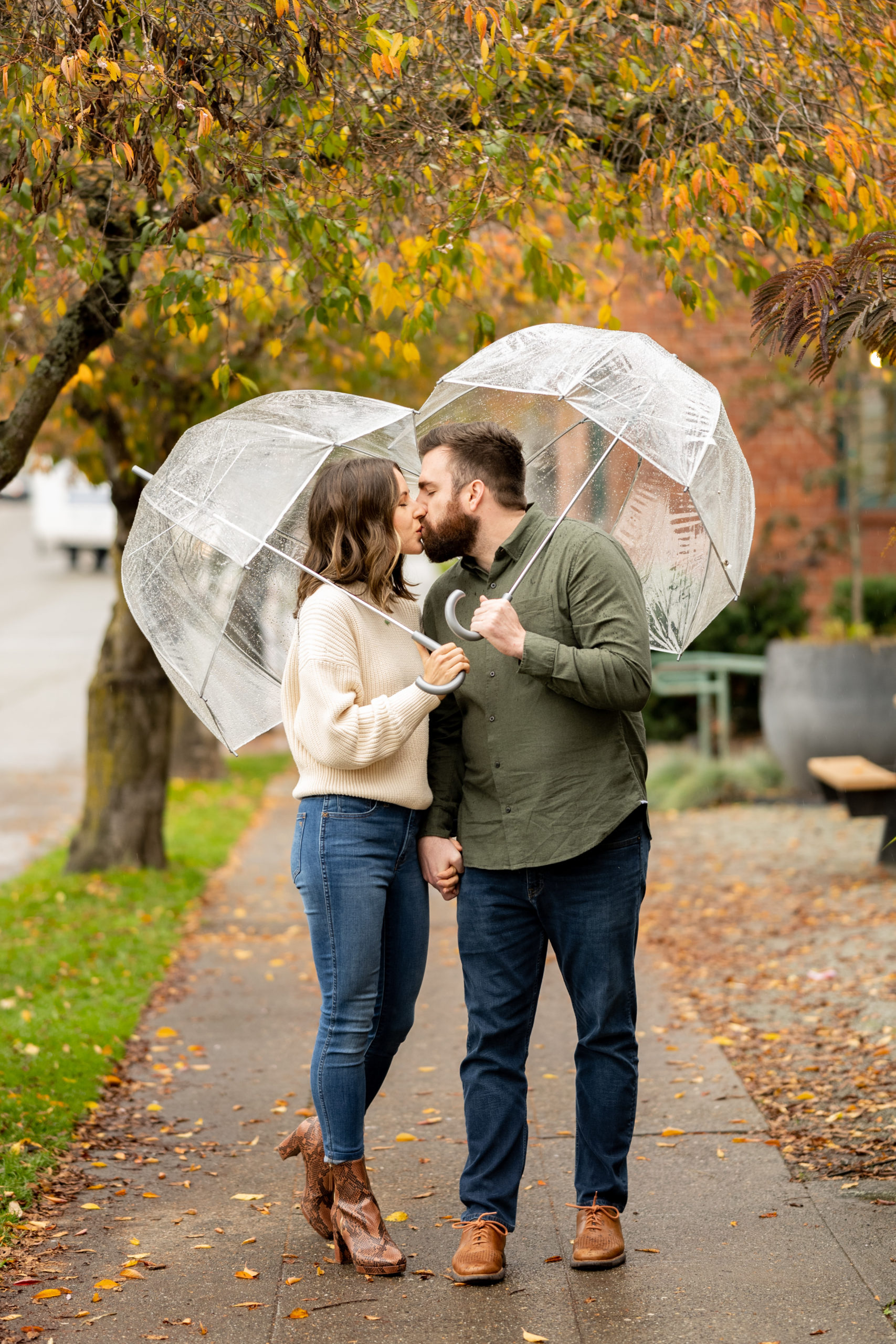 The weather in Seattle is all over the place and can change every 20 minutes. One second it will be a little drizzly, and then the next there will be no rain at all. This is what happened during Nick and Madison’s engagement shoot. It started raining, but then we later got bits of no rain. Instead of letting it ruin the day, we had fun with it! They were also great sports about it.