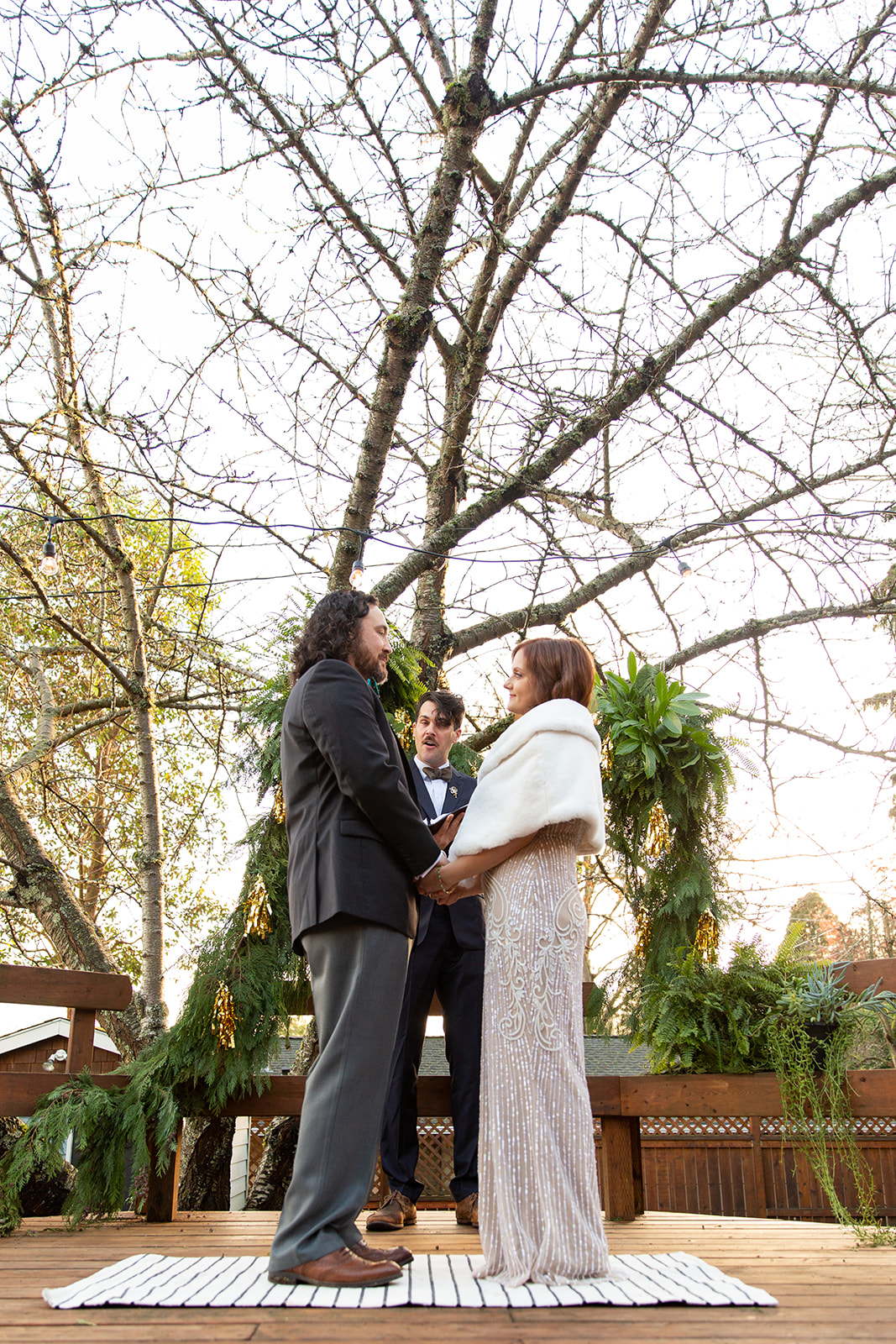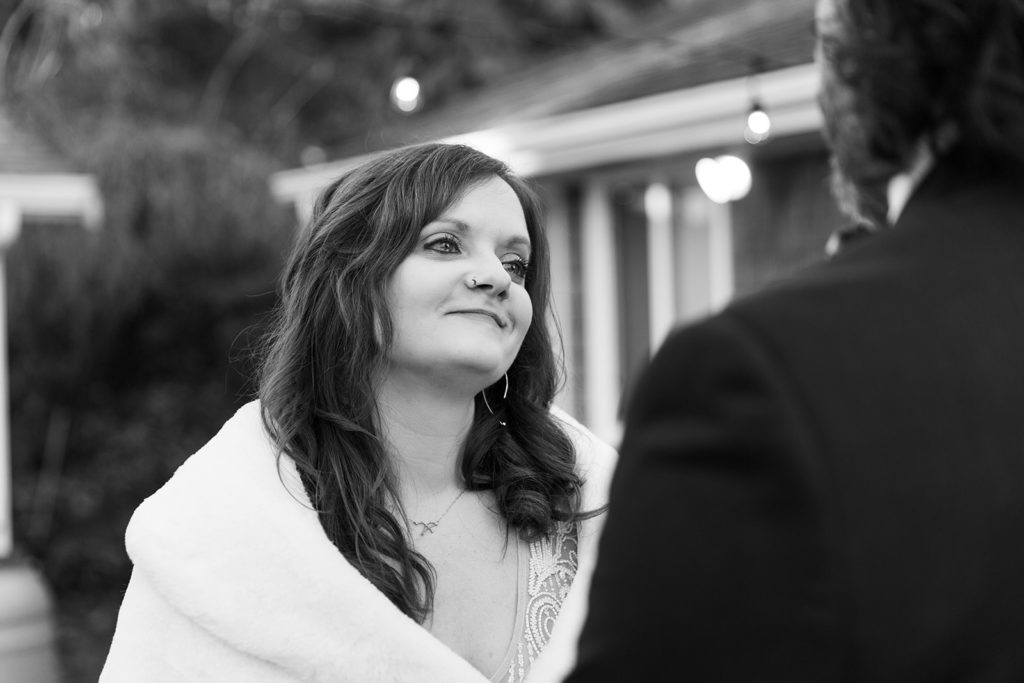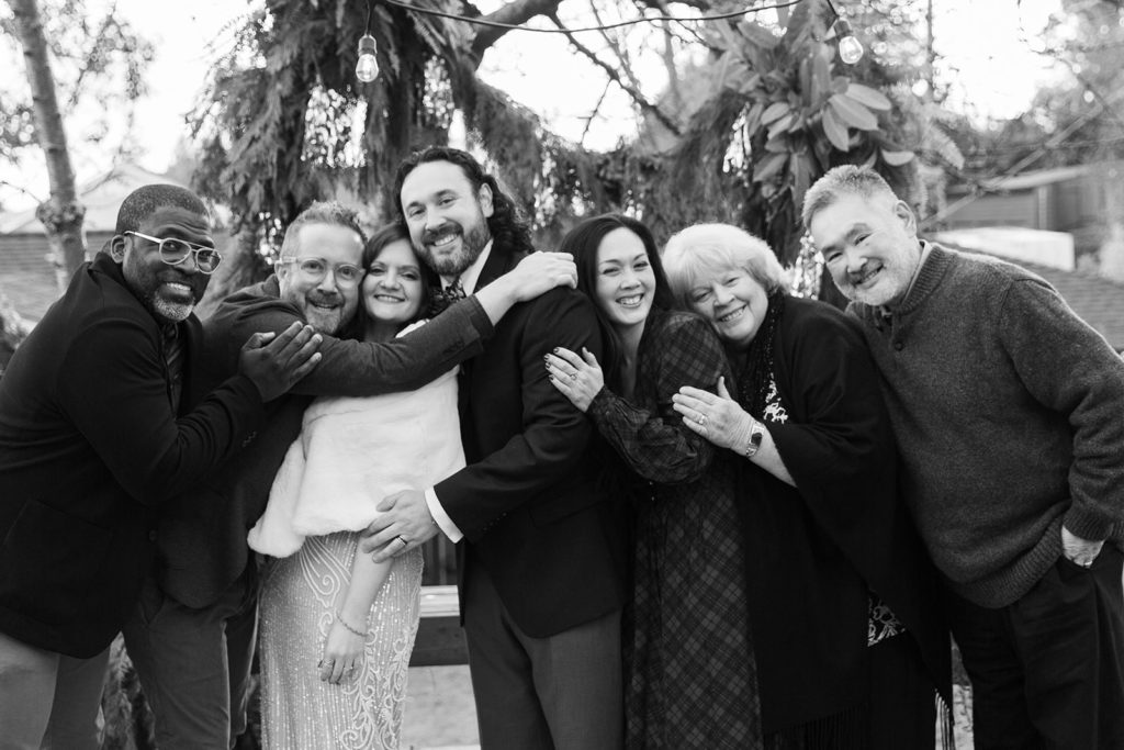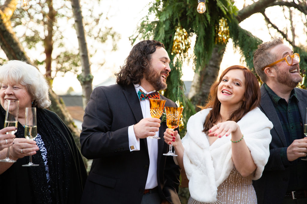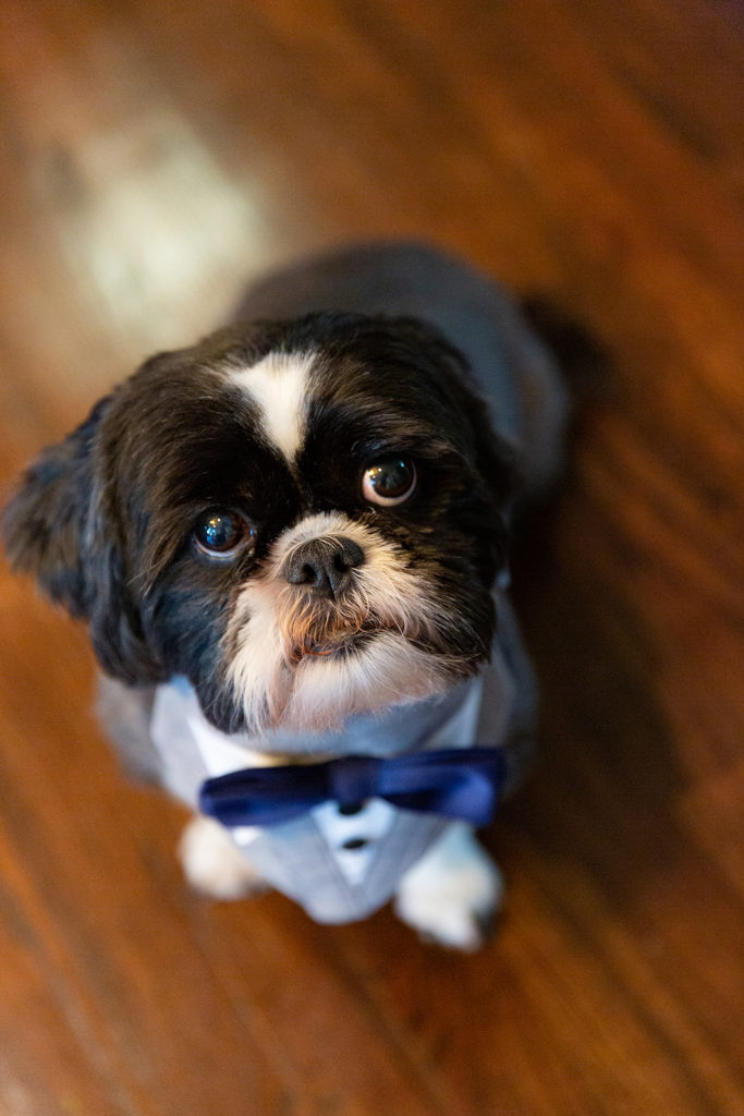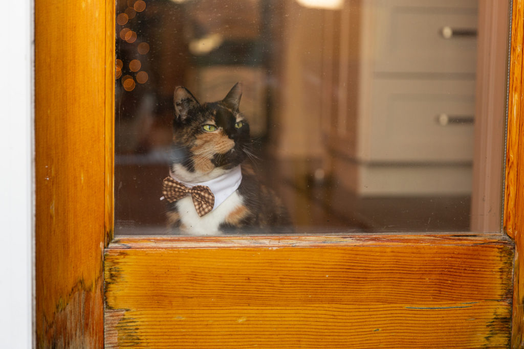 After decidedly choosing to have a small wedding in the park, Kendal and Meagan were forced to rethink “small” for their December 2020 wedding. They pivoted to a guest list limited to immediate family only. With COVID travel restrictions, health, and safety to consider, out of state family still got to join in on the celebration via Zoom and FaceTime. But the new guest list offered the opportunity to host their ceremony in the backyard of their brand new home! As it turned out, the best part of the day for these two was “Celebrating the special milestone in our new home with our family…without the stresses that come along with a large wedding in a rented venue. And having our cat children and our dog nephew with us!” —you’ll agree, too, when you see their outfits in the photos below!!!