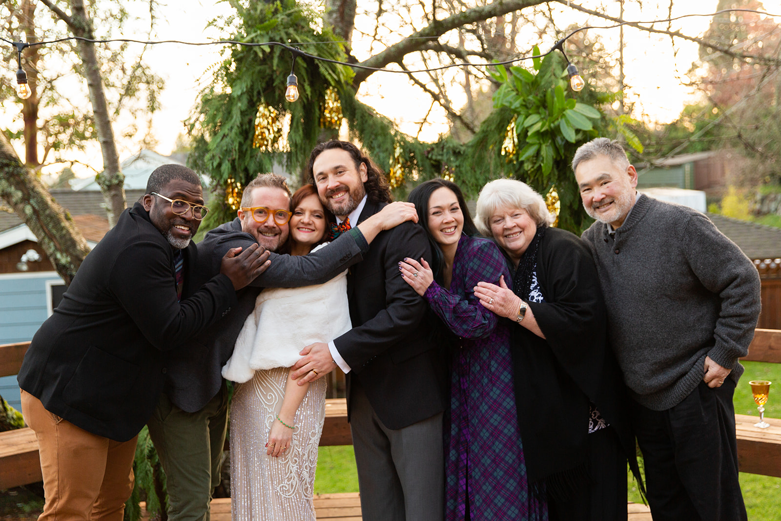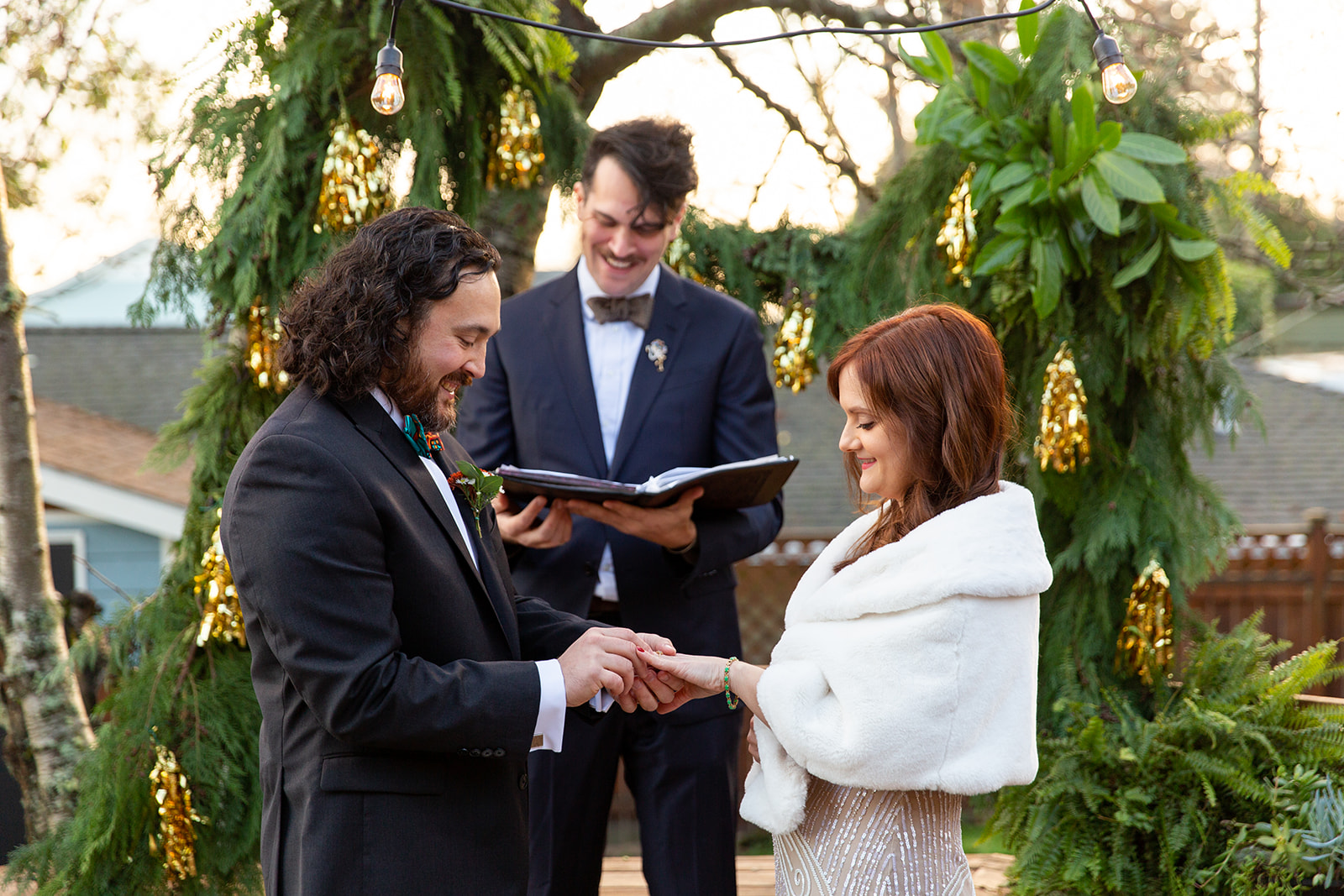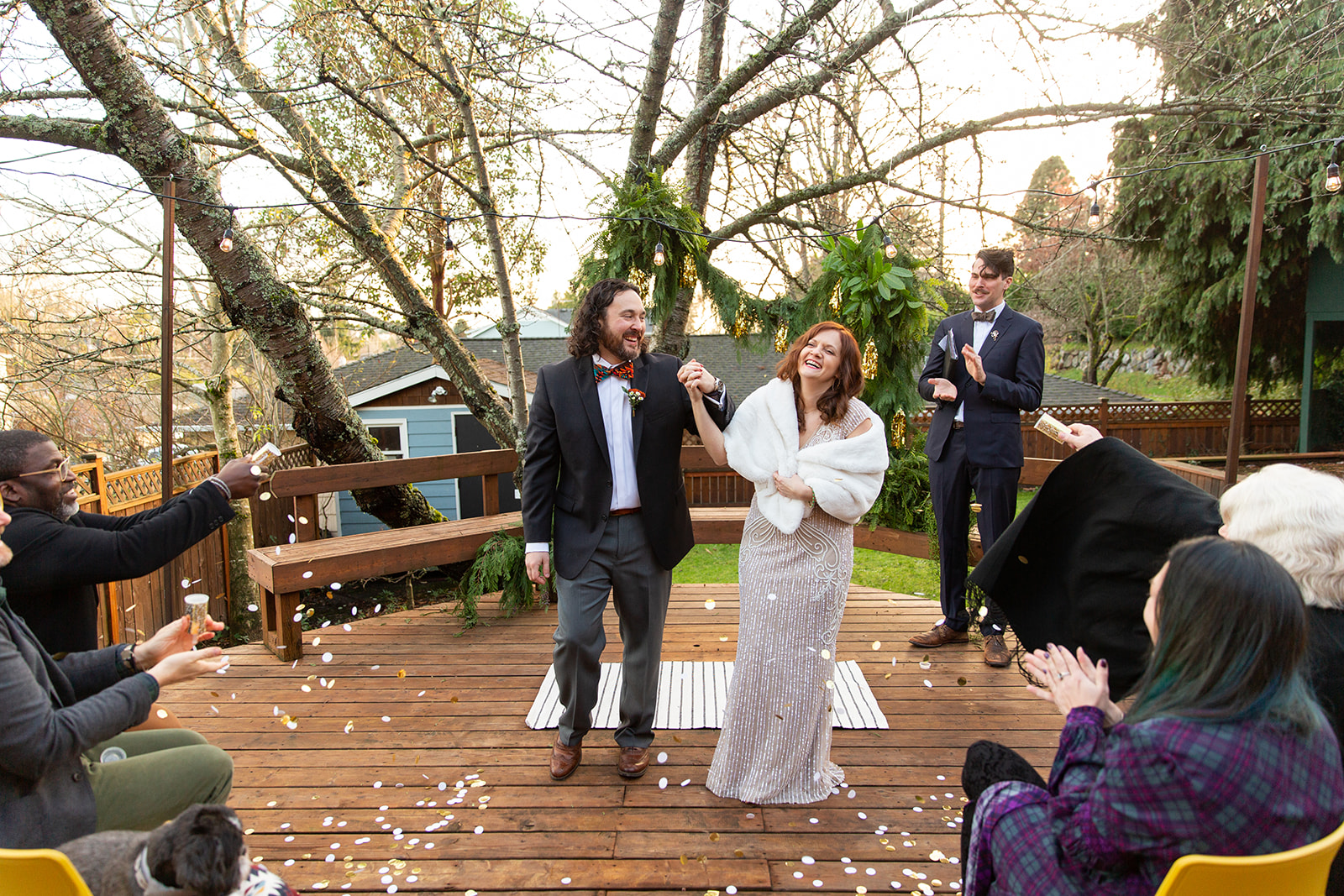 After decidedly choosing to have a small wedding in the park, Kendal and Meagan were forced to rethink “small” for their December 2020 wedding. They pivoted to a guest list limited to immediate family only. With COVID travel restrictions, health, and safety to consider, out of state family still got to join in on the celebration via Zoom and FaceTime. But the new guest list offered the opportunity to host their ceremony in the backyard of their brand new home! As it turned out, the best part of the day for these two was “Celebrating the special milestone in our new home with our family…without the stresses that come along with a large wedding in a rented venue. And having our cat children and our dog nephew with us!” —you’ll agree, too, when you see their outfits in the photos below!!!