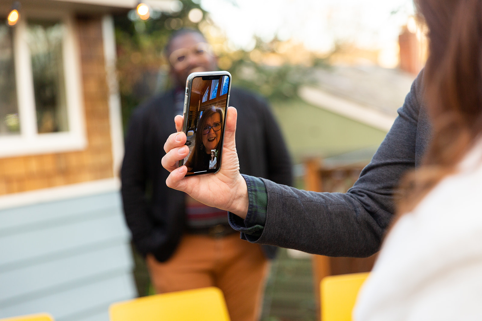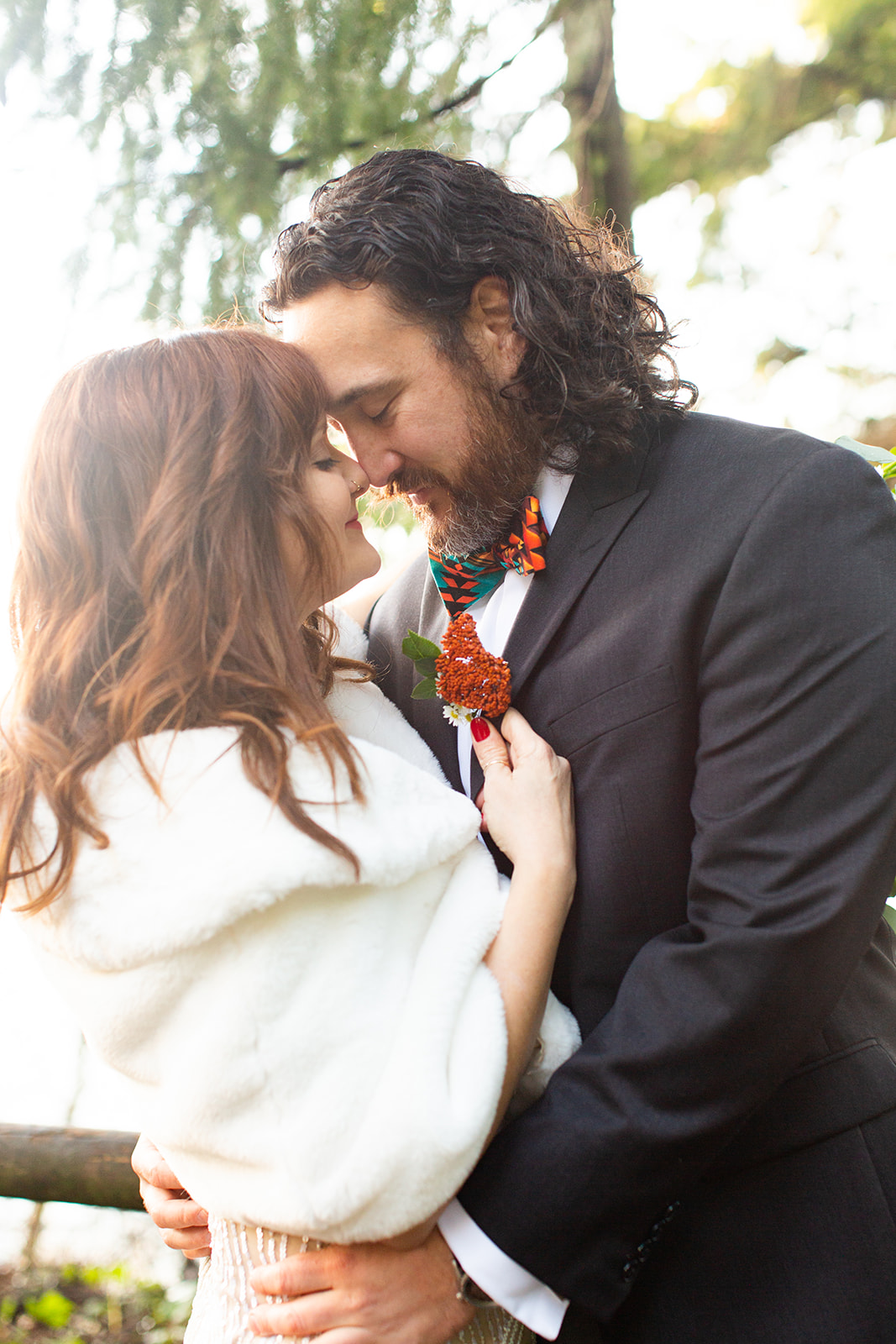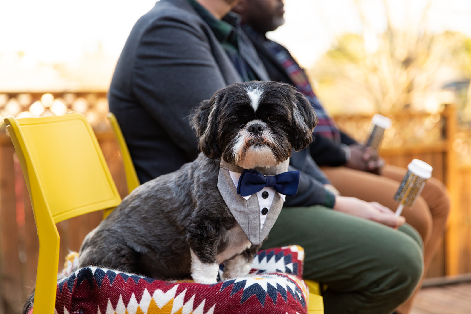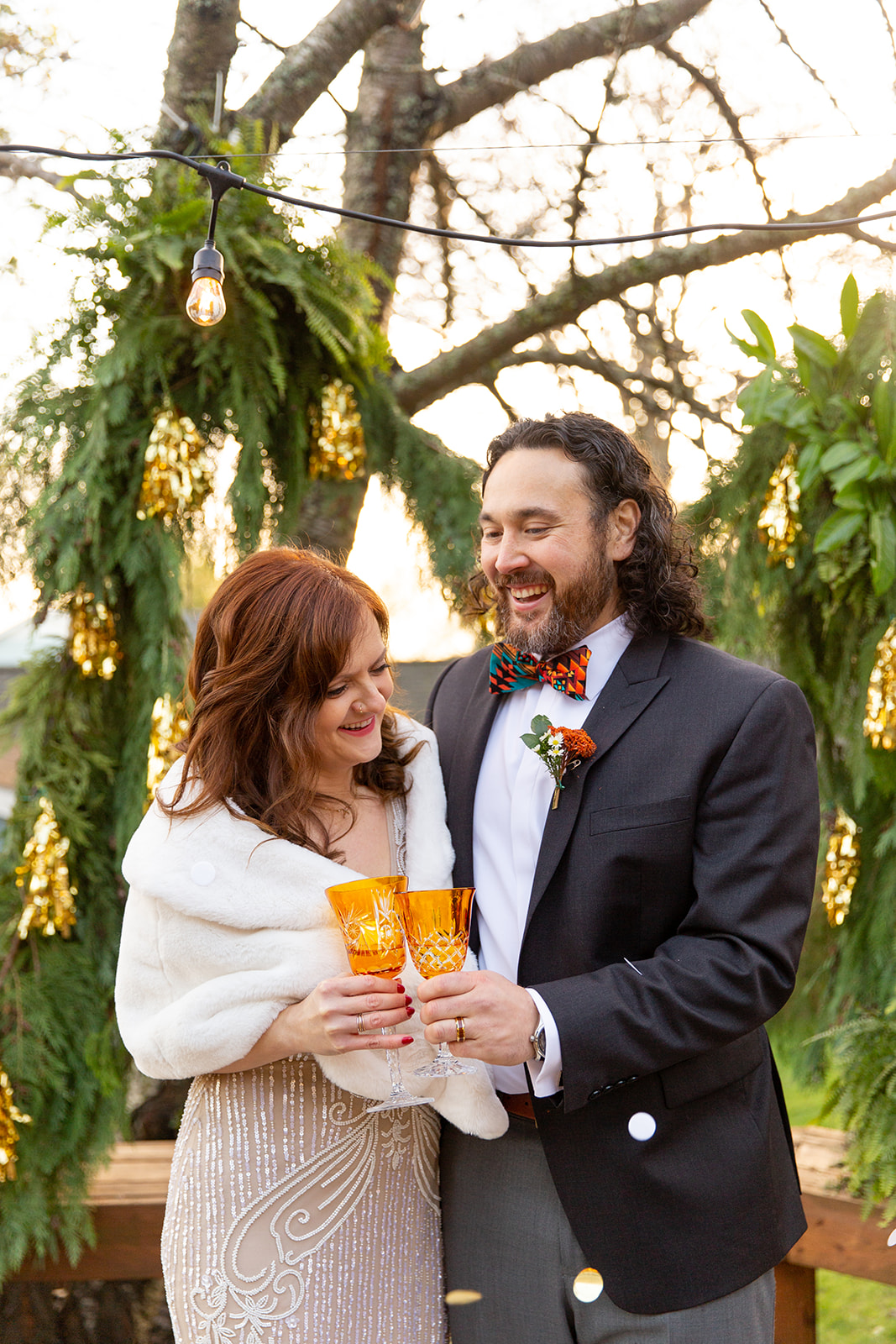 After decidedly choosing to have a small wedding in the park, Kendal and Meagan were forced to rethink “small” for their December 2020 wedding. They pivoted to a guest list limited to immediate family only. With COVID travel restrictions, health, and safety to consider, out of state family still got to join in on the celebration via Zoom and FaceTime. But the new guest list offered the opportunity to host their ceremony in the backyard of their brand new home! As it turned out, the best part of the day for these two was “Celebrating the special milestone in our new home with our family…without the stresses that come along with a large wedding in a rented venue. And having our cat children and our dog nephew with us!” —you’ll agree, too, when you see their outfits in the photos below!!!