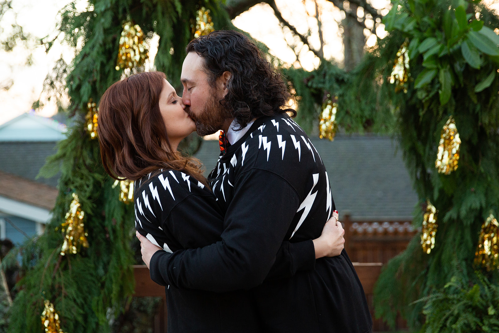 Their wedding day was filled with lots of subtle details that kept their intimate wedding personal. Like zhuzhing up their home with references to their favorite show, Schitt’s Creek! There were little Simply The Best details from the show in their decorations like the marquee sign in the photo below and it was even their wedding song! If you’re not in the know, click here, because this song is the absolute sweetest. And as the ceremonies ended, the newly weds cozied up in David Rose’s iconic Lightning Bolt Sweater from season 5 of the show.