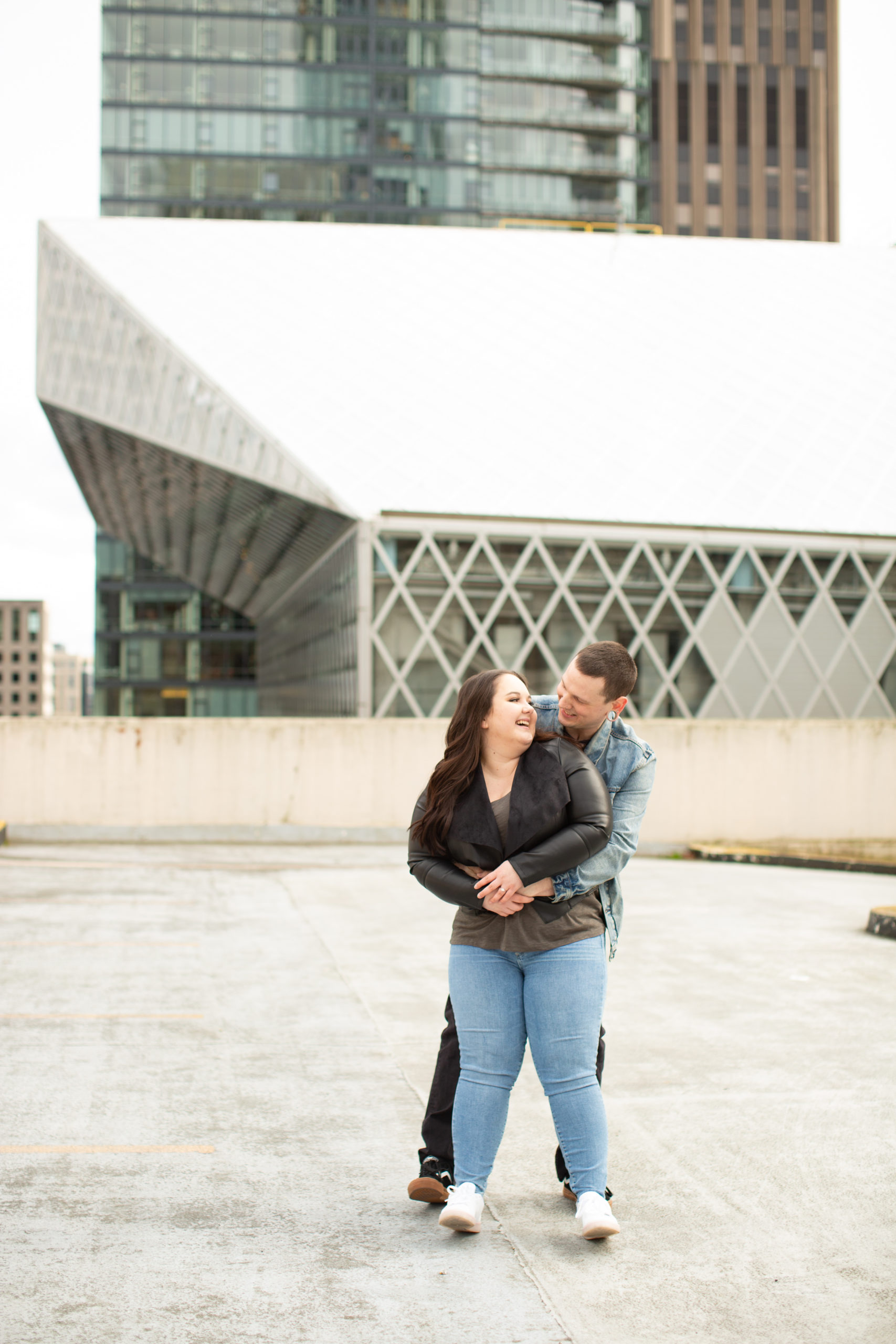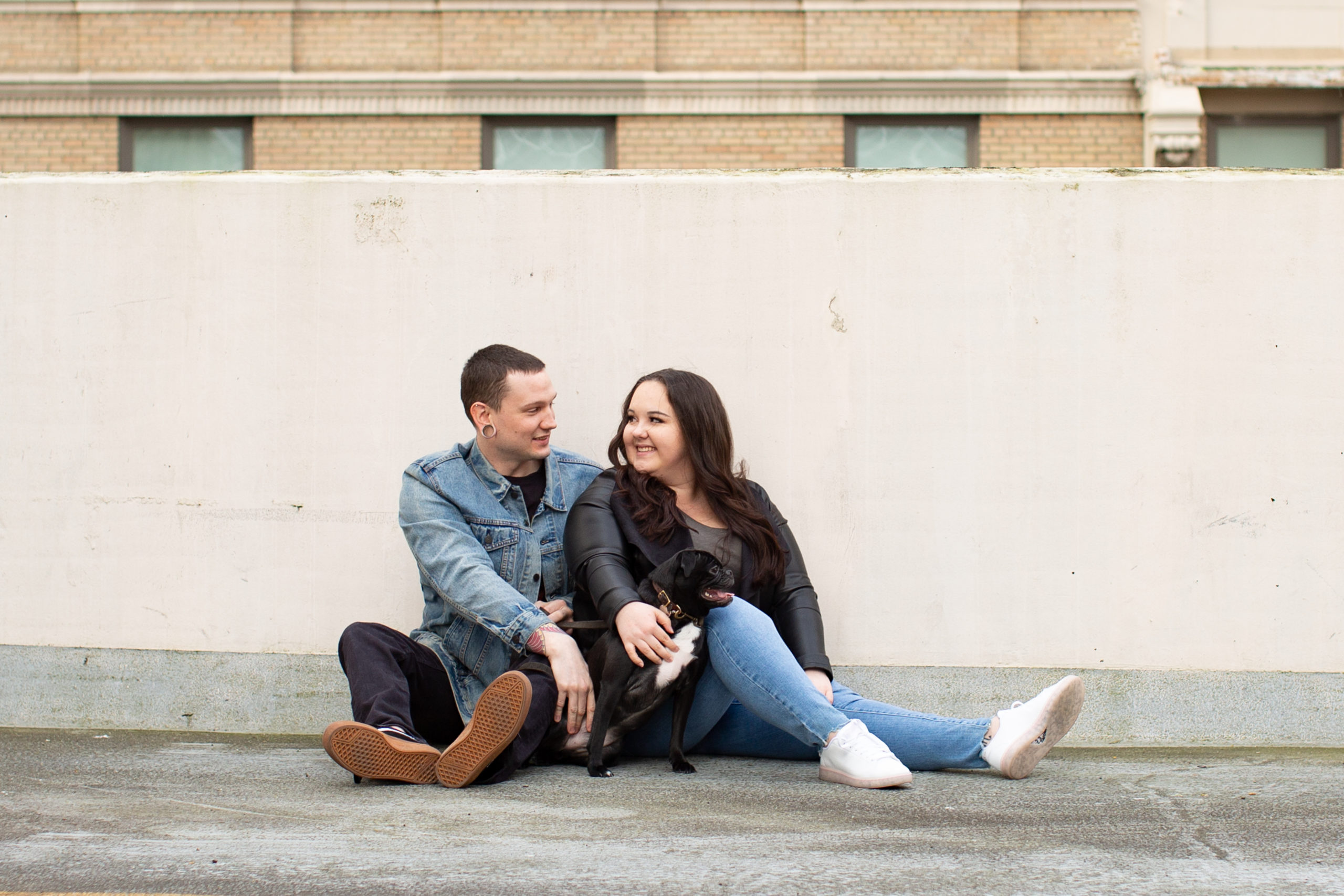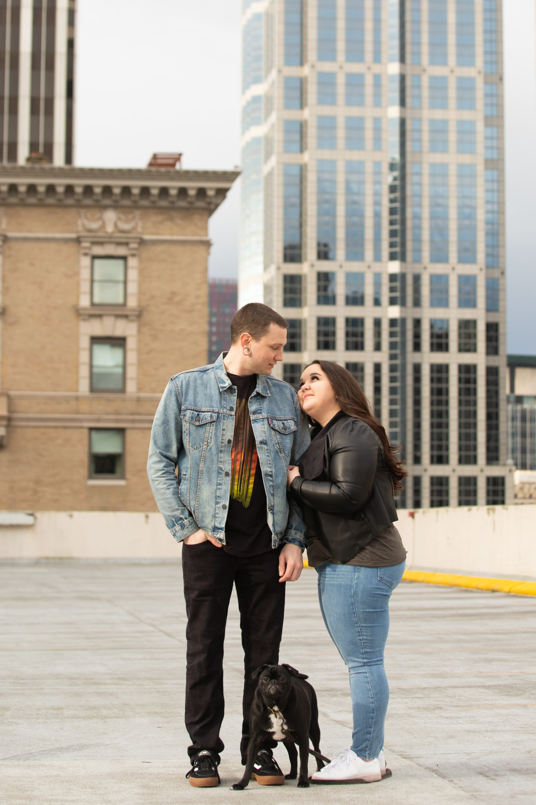 We started their photoshoot at a parking garage rooftop in downtown Seattle to capture that cosmopolitan feel and these two knocked it out of the park. Their connection brought all the warmth to the hardscape and truly filled each frame with their love for each other! I had a blast with Morgan and Adam during their engagement session and we had fun just getting to know each other—mostly talking about Bugsy, their playful little pug.